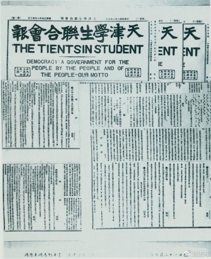 1919年7月21日,周恩來任主編的《天津?qū)W生聯(lián)合會報》創(chuàng)刊??掠糜⑽膶懼懊裰鳎阂粋€民有、民治、民享的政府——我們的箴言?!?/span>